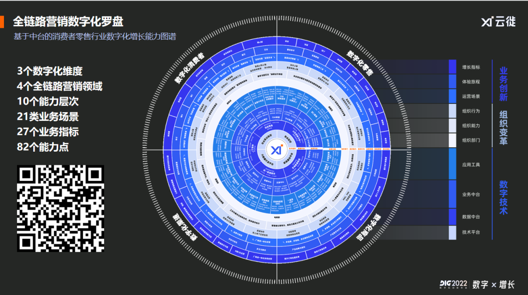 全链路营销数字化罗盘是基于数字技术平台的创新延伸到企业自身业务能力、组织能力的沉淀与积累,然后基于业务能力与组织能力来真正实现对前端业务场景的创新支撑。