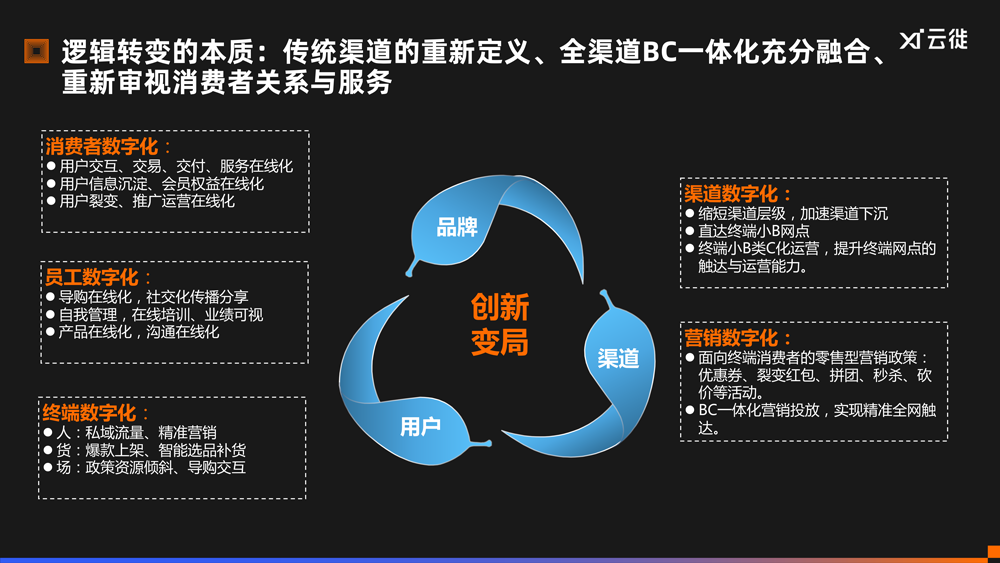 企业要完成这种转变,需要关注2个关键词:创新和变局;3个维度:品牌、渠道、用户;5个数字化能力:渠道数字化、营销数字化、终端数字化、员工数字化、消费者数字。