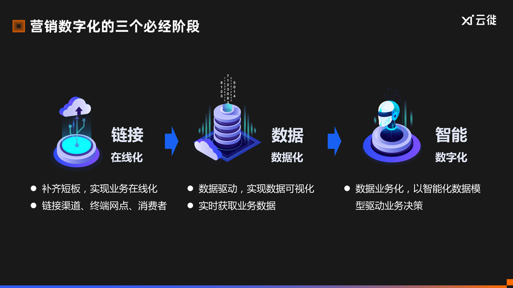 第一时间,从整体来看,营销数字化可以分为3个阶段:在线化、数据化、数字化。在线化强调链接,数据化强调业务数据化,数字化则强调智能决策。