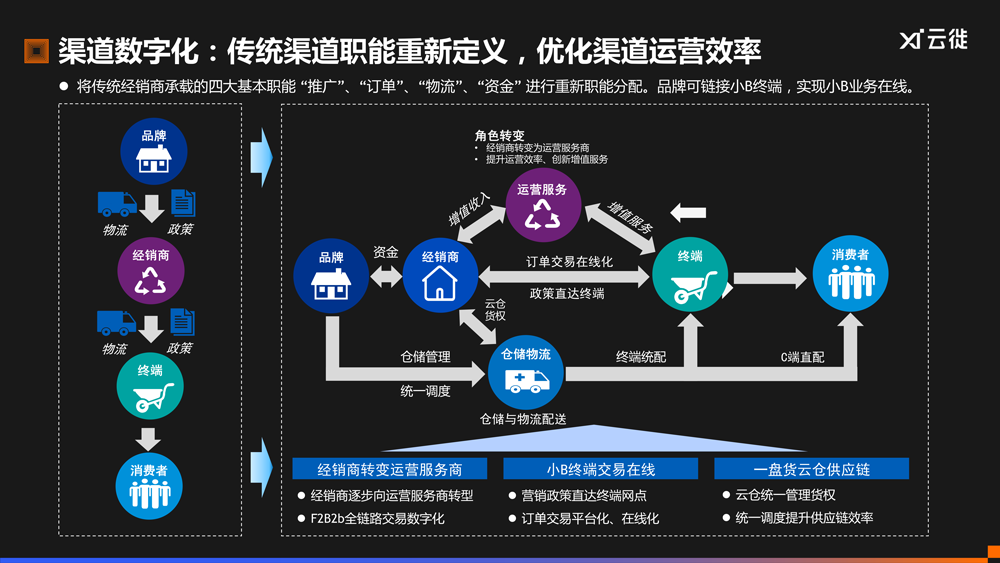 渠道数字化:将传统经销商承载的推广、订单、物流、资金4大基本职能进行重新分配,优化渠道运营效率。