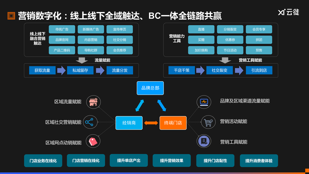 营销数字化:品牌需要做流量赋能和营销工具赋能,即品牌线上和线下的营销触达所带来的流量,一定要流向线上或线下的终端;若终端的数字化能力水平达不到要求时,品牌还需要进行营销工具的赋能。