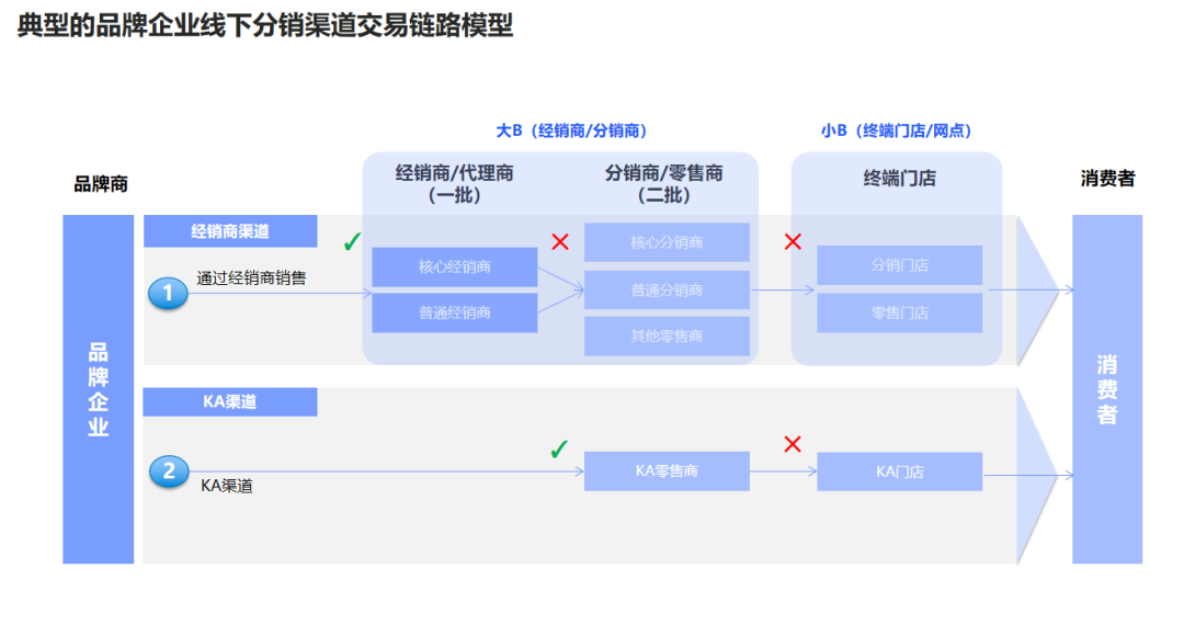 很多品牌商企业,线下分销渠道大体可以分为2类:一类是经销商渠道,一类是KA渠道。