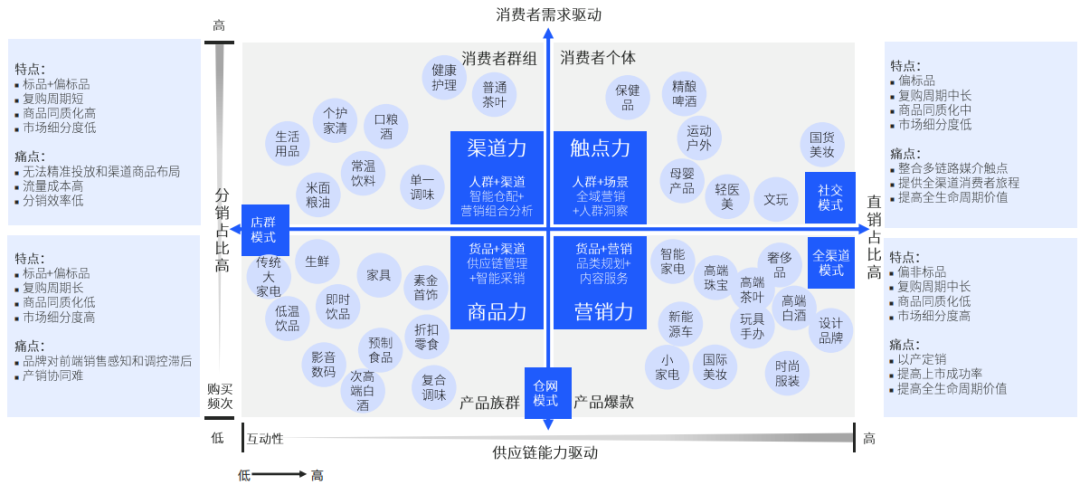 第一时间,明确定位细分品类层[非行业层]核心业务驱动力,支撑各品类长期稳健增长的核心驱动力有明显差异,即使在同样消费者需求驱动及供应链能力驱动层面也会出现关注个体价值和群组价值的区分;比如,信任度高、品牌力低、受众精度高、产品差异化大的细分品类的“私域”运营性价比较高,更应把触点力和营销力作为核心业务驱动力建设,而其他驱动力是非业务核心驱动力,只作为基础能力存在。